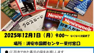 浦安市国際センターの図書コーナーでは、国際的な雑誌を定期購読しています。 毎年恒例のバックナンバー無料配布を12月1日(月)9時~行います。 予め袋に3~4冊ずつ、国際色豊かな書籍を詰めてあります。 くじを引いて出た数字 […]