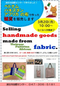 2026年02月25日 / 最終更新日 : 2026年02月25日 uicweb 国際センターからのお知らせ 【予告】外国の布で作った雑貨を販売します 3/2(月)10時~ ベトナム、パキスタン、アフリカの布で作った、 バッグやキーホルダーなどを販売します。 (※寄付された布を使って、国際センタースタッフで作りました) 数に限りがありますので、 お一人様、各種1点までのご購入でよろしくお願いします。 売り切れ次第終了となります 5 total views, 5 views today